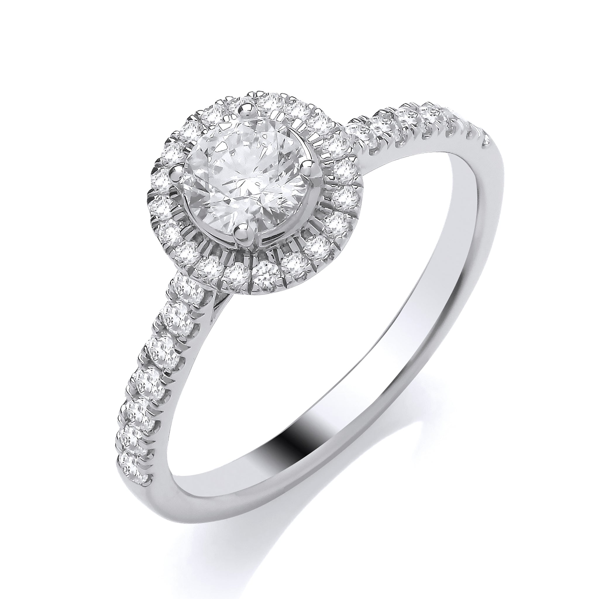 A stunning brilliant cut halo diamond ring with stone set shoulders from Mark Josef Jewellers laboratory grown diamond ring collection.